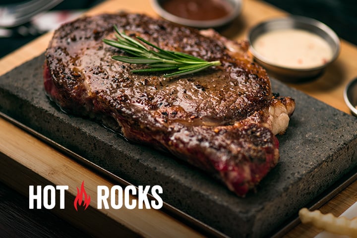 Indulge in sizzling meals prepared on lava rocks, surrounded by an inviting tropical island atmosphere.